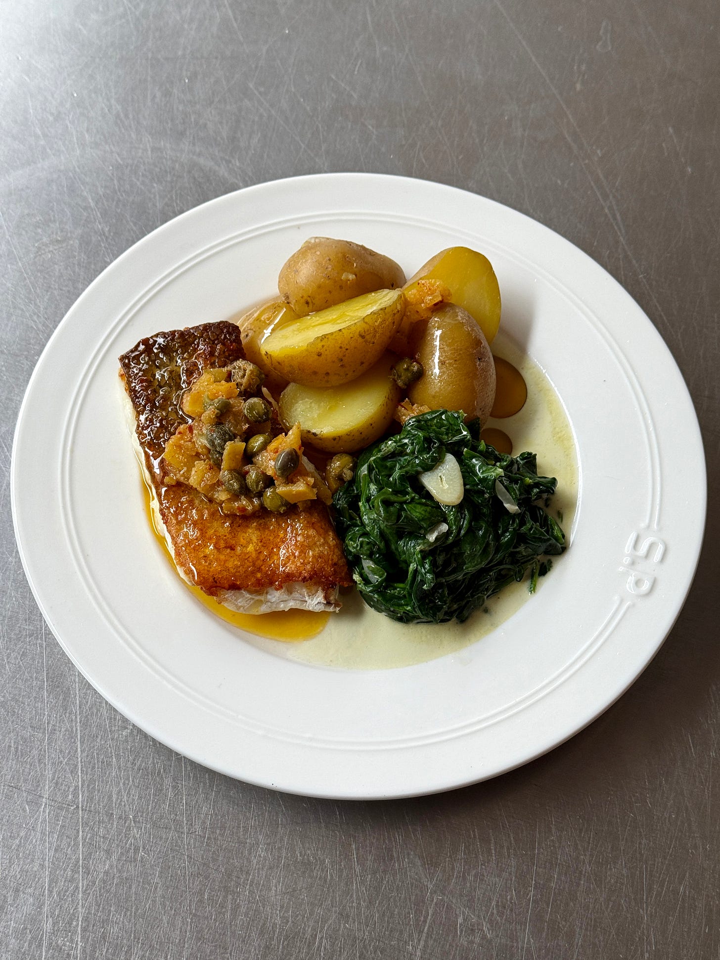 I got to cook with Ruthie Roger’s a few months ago and many of the things she said have stayed with me - one in particular being “I don’t like food served on top of other food” - not something I’ll strictly follow as I love a bit of dog bowl situation but I had it ringing in my mind as I put this dish together. Served with a perfectly cooked piece of fish, some boiled potatoes, and gently cooked spinach with young garlic and a splash of cream. The cream splits away from the spinach and mixes with the lemon infused oil and all though the flavours have strength they don’t take away from the delicate flavour of this fish.