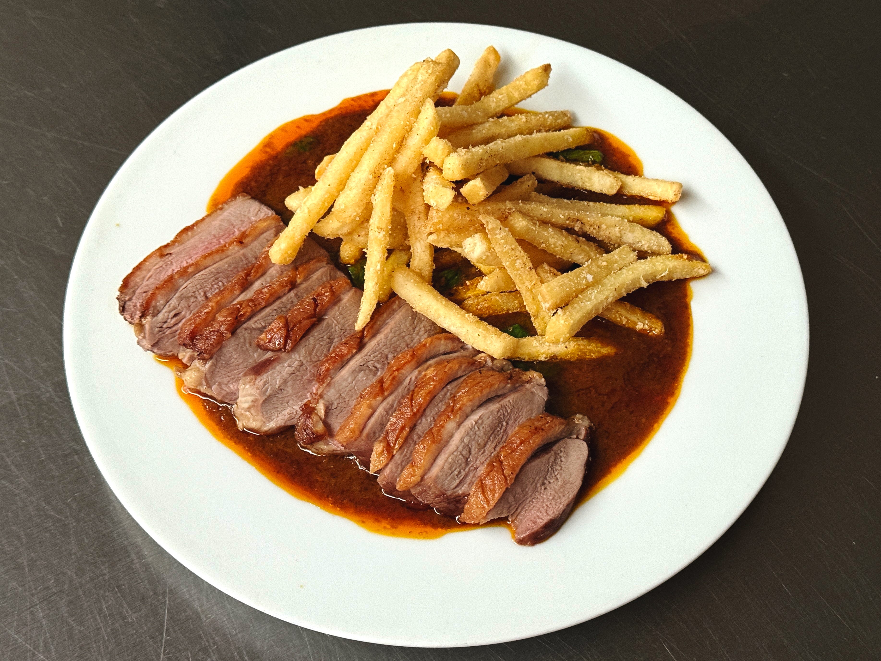 Serving fries to soak up a rich, spicy, fragrant curry is an indulgent alternative to rice that feels special when made at home. The whole experience sits somewhere between a classic duck curry and steak frites. Some of you will think I’ve overcooked the duck, and you’re sort of right, but I prefer it medium when it’s in a sauce like this. Make it however you like it best.