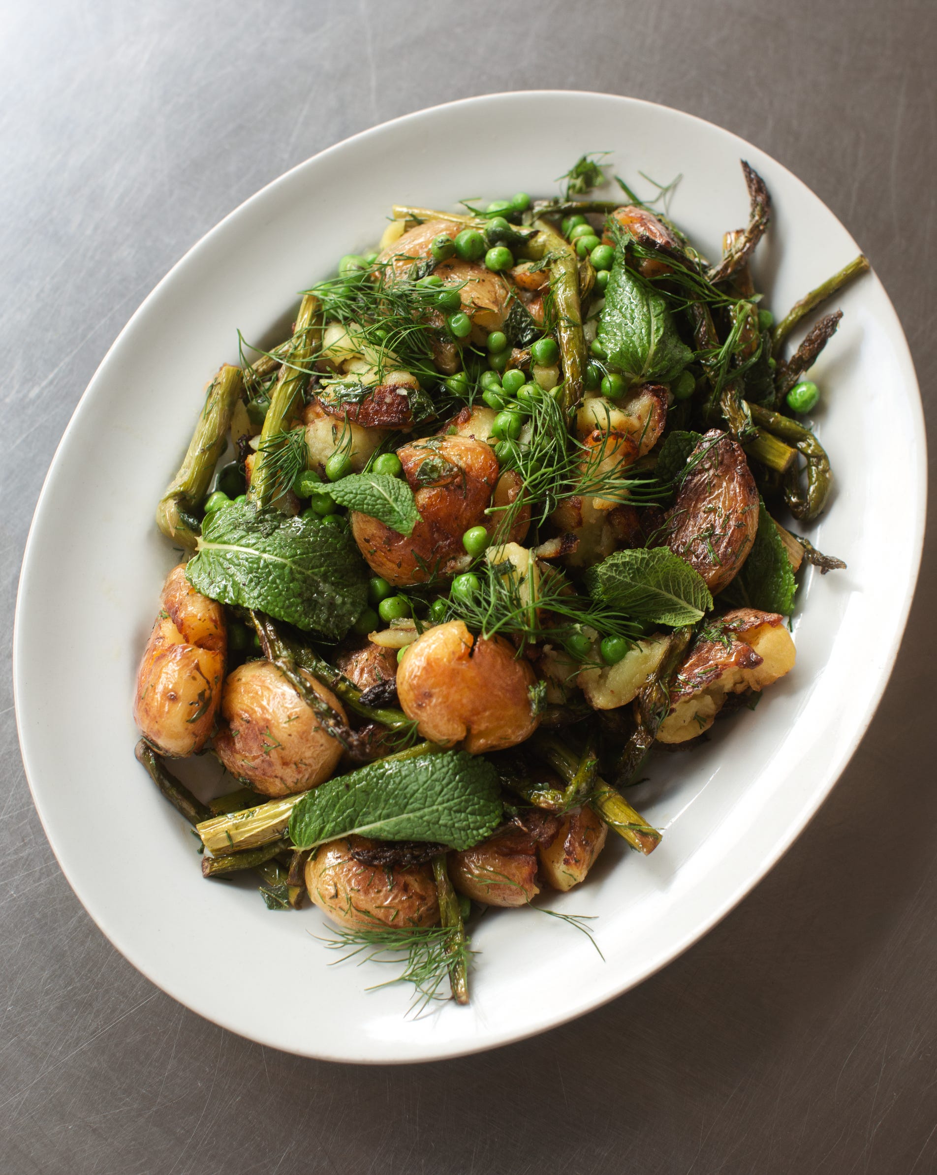New potatoes are parboiled, gently crushed, and then pan-fried until they crisp. From there, they are folded through a tangle of greens - the sort that feel inseparable from spring and Easter lunch.